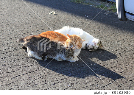 寄り添って何か噂話でもしている三毛猫と黒猫