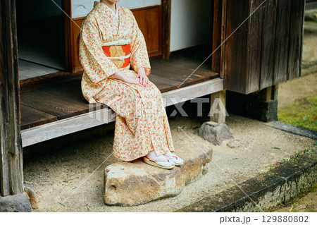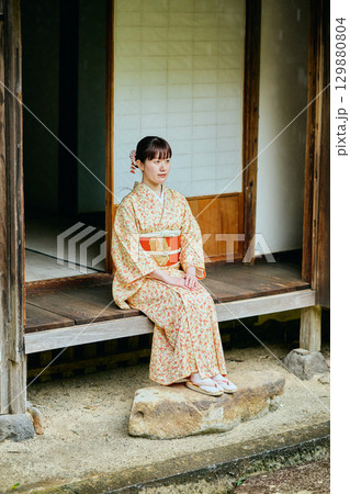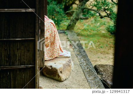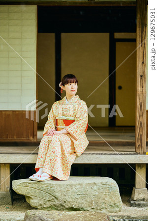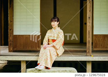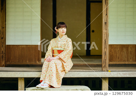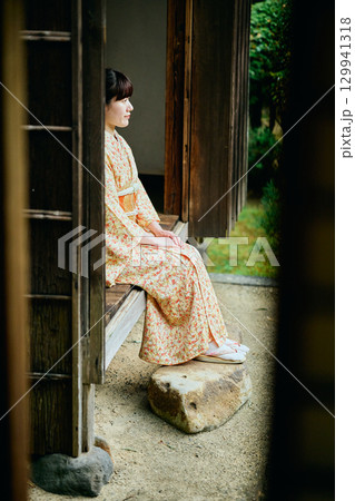 縁側で静かに佇む着物姿の女性