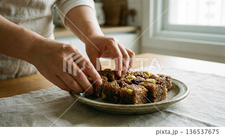 Hands Arranging Korean Yakbap Sweet Rice Cubes on Ceramic Plate Close View