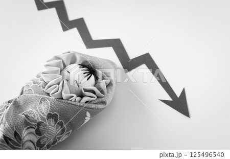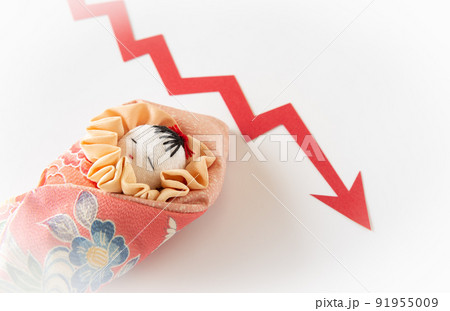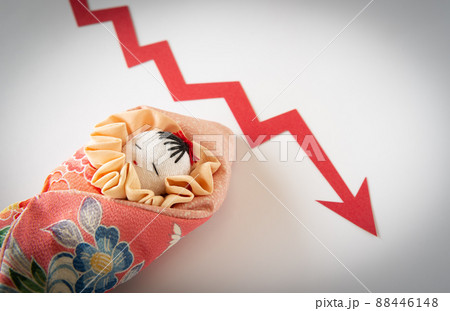 手作りの赤ちゃん人形と矢印 少子化 赤ん坊 出生率 おくるみの赤ちゃん