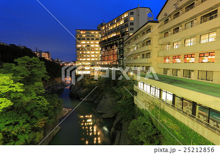 鬼怒川温泉 鬼怒川沿いくろがね橋の鬼怒子の湯と鬼怒川温泉町並み