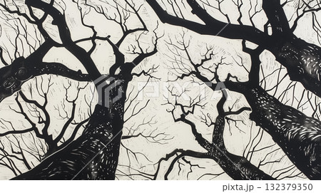A graphic depiction of stark black tree branches crisscrossing against a contrasting white background.