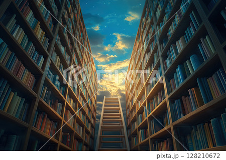 Library in the sky. High shelves filled with books and a staircase leading to the sky.