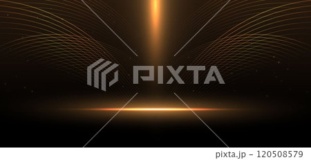 Abstract elegant gold glowing curved lines with lighting effect sparkle on black background.