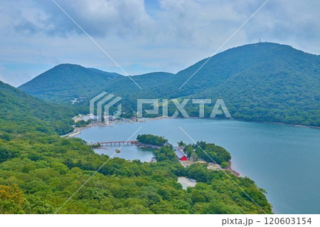 夏の群馬県 赤城山(地蔵岳)の大沼側の1600m付近から黒檜山と大沼方面を見る