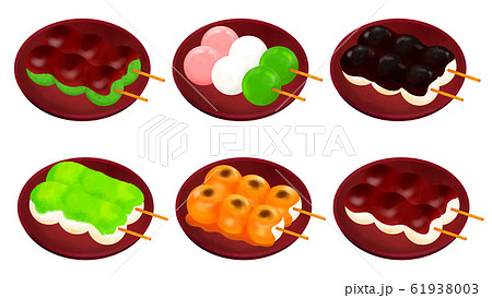 甘味屋の食べ物イラスト(あんみつ・かき氷・お汁粉、桜餅、かしわ餅)