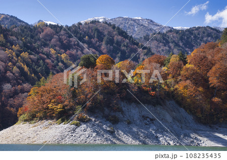 黒部ダム(黒四) 遊覧船ガルベから見る美しい三段紅葉と平乃小屋の眺め 富山県立山町