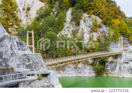 秋の立山黒部アルペンルート 紅葉の黒部ダム(黒部湖) カンパ谷の吊り橋