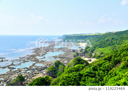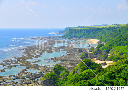 沖縄県八重瀬町具志頭のぐしちゃん浜の海と青空と岩の風景