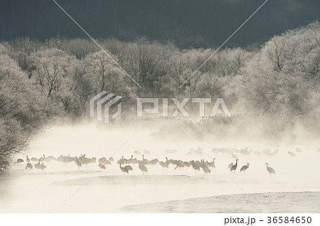 朝陽に輝く樹氷と川霧と丹頂鶴(北海道・鶴居)
