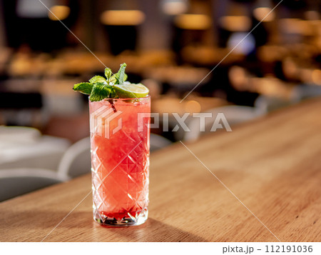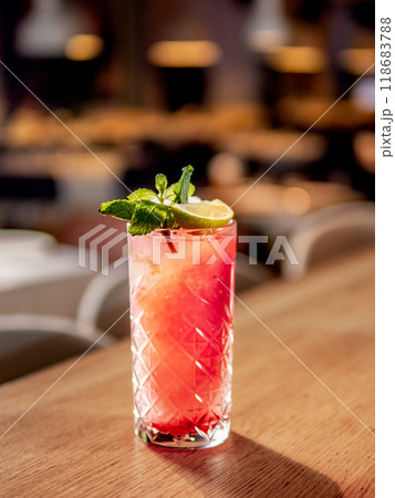 Red non-alcohol cocktail with crushed ice in glass on wooden bar counter in restaurant interior. Gin alcohol cocktail decorated lime and mint. Pink cold alcoholic cocktail in bar or nightclub
