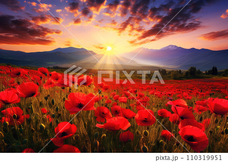 AI-generated content. Beautiful field full of red poppies, mountains on the background, backlight, against the sun