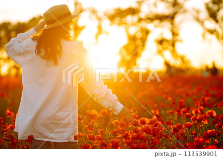 Happy girl poppy field walks under the evening sun. Back view
