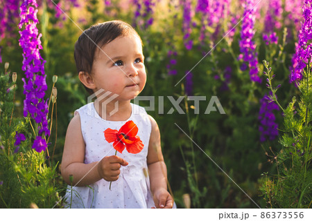Emotional child outdoor portrait of nice little girl in white dress with one poppy in her hands.
