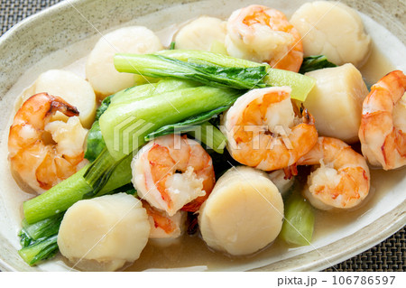 海老と帆立とチンゲン菜の炒め物(あんかけ)。