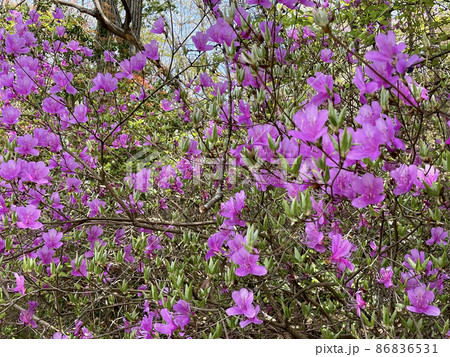 三田市 中央公園 北東側のエントランスからの道の山側に咲く群生するツツジ をアップで