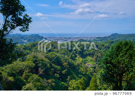 秋の鎌倉市の天園ハイキングコースの建長寺勝上献展望台から南側眺望(鎌倉市,相模湾など)