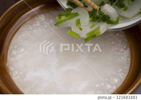 七草粥 土鍋で炊いた七草がゆを炊く 料理シーン