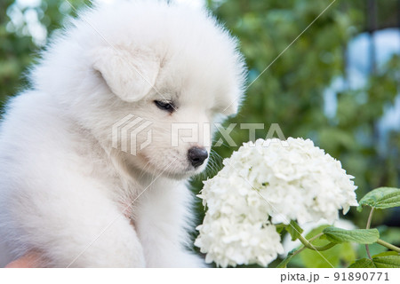 アジサイの匂いを嗅ぐ子犬のロングチワワ