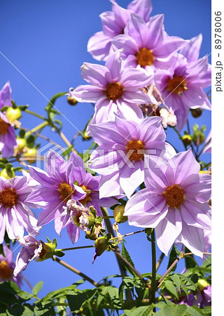 青空を背景にした皇帝ダリアの花 (ある晩秋の晴れた日)