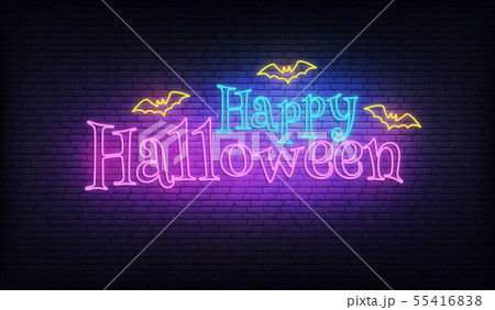Halloween neon vector sign. Glowing Halloween neon typography with flying bats