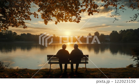 Elderly couple sitting on a bench swing watching the sunset in a park. Concept of togetherness and aging. For relaxation-themed visuals.