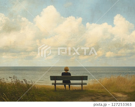 A person sits quietly on a bench, gazing out over the calm ocean waters. Lush grass surrounds the area, and fluffy clouds float above, creating a serene atmosphere.