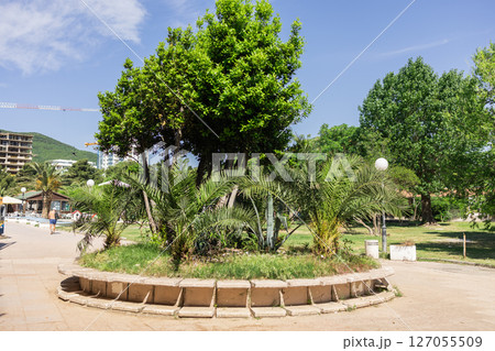 Park with palm trees and greenery. Urban nature, summer recreation, and landscape design in Mediterranean Montenegro public space.