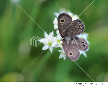 ニラの花の蜜を吸うオオヒカゲ