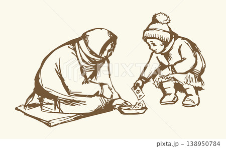 Vector Drawing. Girl Giving Alms to a Beggar