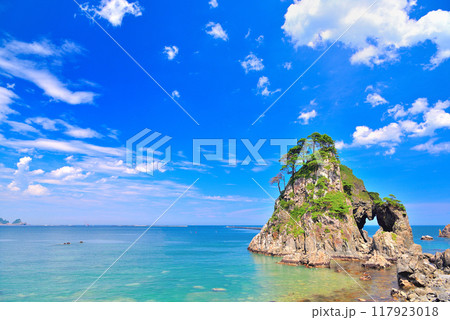 東北・小袖海岸・思わず出掛けたくなる久慈の美しい風景、釣鐘堂と夏空のイメージ・岩手県久慈市