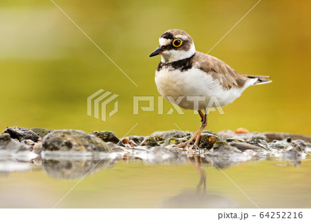 Wild little ringed plover walking on rocks of riverbank with reflection on water