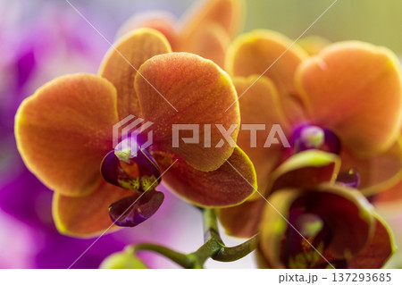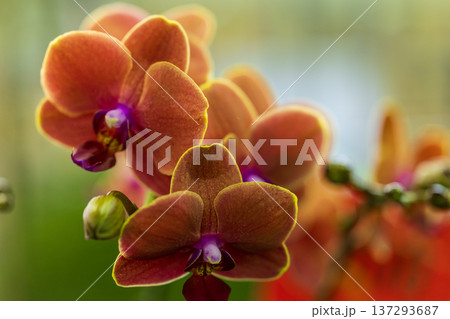 Floral nature. Orchid flower bright color. Flowering nature. Orchid flower orange color. Floral macro photography. Flora and nature closeup. Orange orchid flower