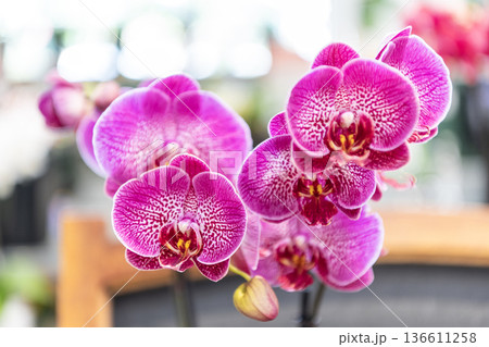 Beautiful pink Phalaenopsis orchid branch with blooming flowers in soft light. Elegant tropical Orchidaceae plant for home decor and garden design.