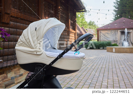 A fashionable and stylish baby stroller is being pushed along a charming cobblestone path