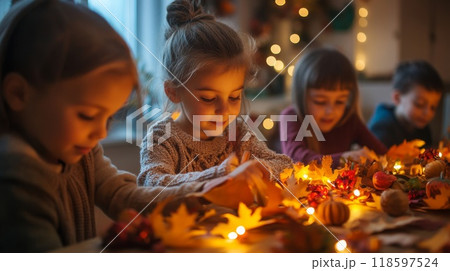 Children Gather Around a Table Decorated with Autumn Leaves and Fairy Lights
