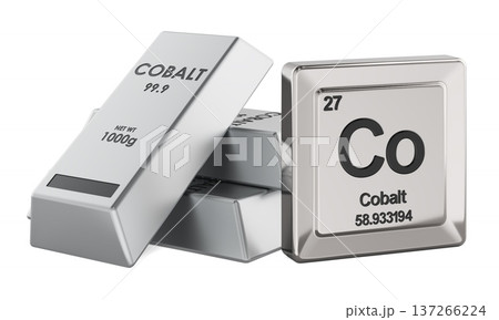 Cobalt metal ingots with Co chemical element, periodic table tile. 3D rendering