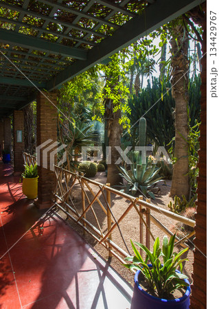 Cacti on rose sand bamboo trees in amazing cacti Majorelle garden. View from covering footpath,