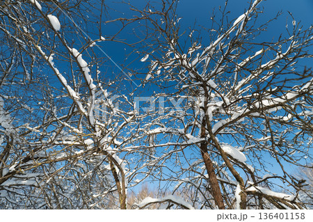 Intricate snowy branches creating abstract pattern against cobalt sky, rhythmic lines and high contrast produce graphic visual ideal for backgrounds and modern design projects