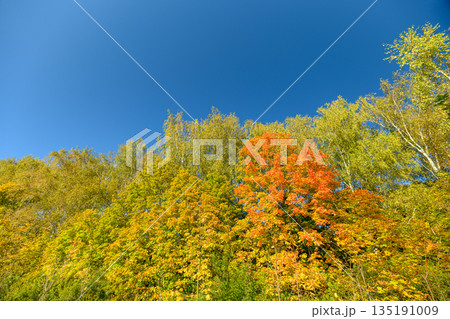 Colorful tree amidst autumn sky, Juicy orange sprout surrounded by yellow foliage, Youthful orange young tree contrasted by bright yellow leaves under clear cerulean sky