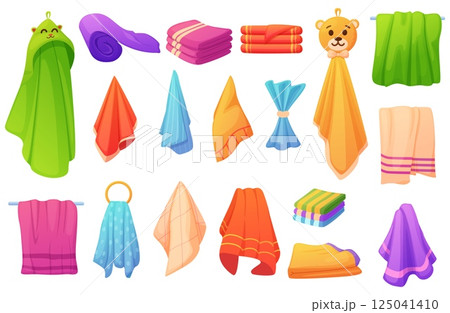 Cartoon towels. Soft fabric towel for kitchen, bathroom, beach relax, spa and wellness. Isolated bright cloth elements in rolls piles, nowaday vector set