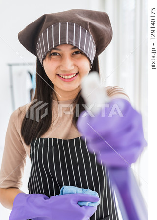 Smiling Asian young lady spray detergent to clean room window
