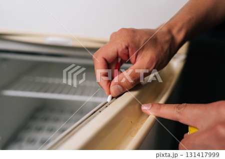 Close-up hands of unrecognizable man cleaning rubber seal of refrigerator door using cotton swab, ensuring hygiene and proper sealing. Concept of domestic work, housekeeping and household.