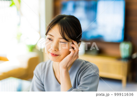 Woman pressing hand against temple while sitting in living room wearing green top, copy space