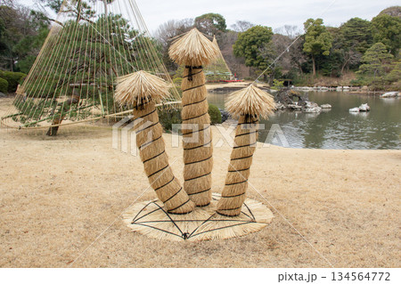 旧芝離宮恩賜庭園のソテツの冬支度 こも巻きとわらぼっちが彩る日本庭園の冬景色