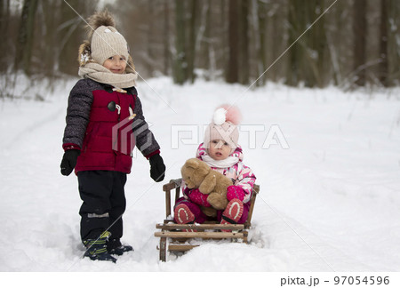 Children ride on a vintage wooden sled against the backdrop of a winter forest. Brother and little sister on a winter walk.