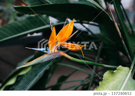 Strelitzia reginae blooming in greenhouse in winter.