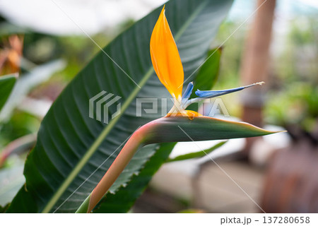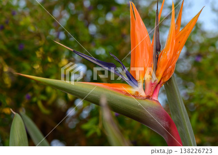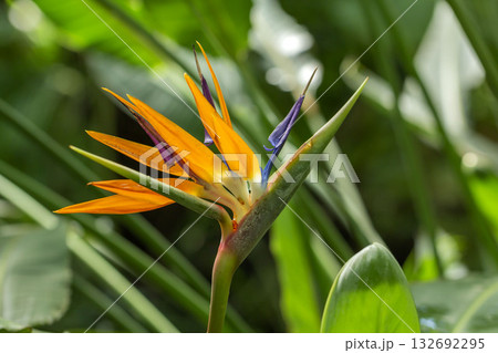 Close-up of exotic Bird of Paradise flowers in a tropical garden in Tenerife