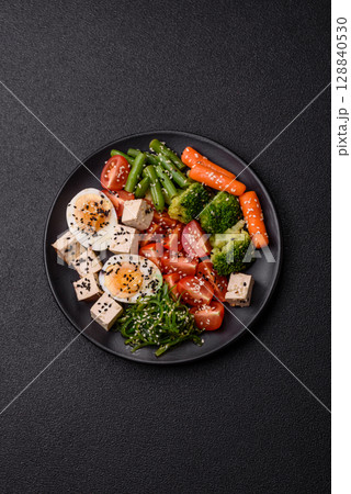 Vegan salad, bowls with chickpeas, broccoli, tomatoes, tofu cheese and boiled eggs