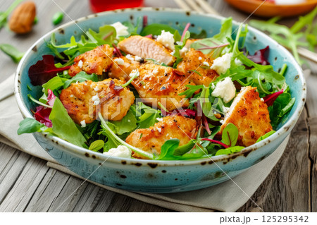Fresh salad with grilled chicken and feta served in a vibrant bowl on a rustic wooden table for a healthy meal